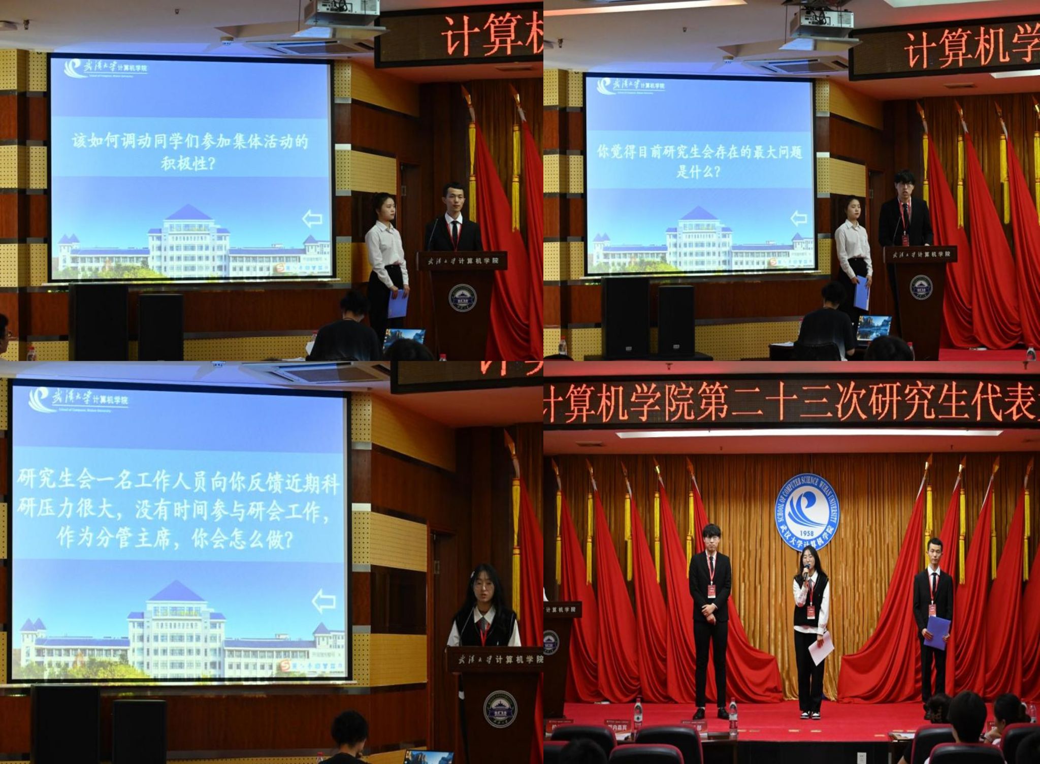 随后,新一届主席团候选人按抽签顺序依次登台发表竞选演讲,并进行一分钟的现场抽题答辩。